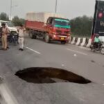 पतंजलि पीठ के सामने राजमार्ग पर बना गड़ढ़ा