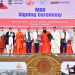 हरिद्वार। ज्ञान भारतम मिशन, संस्कृति मंत्रालय के द्वारा आज हरिद्वार में आयोजित एक समारोह में पतंजलि विश्वविद्यालय को “क्लस्टर सेंटर” के रूप में मान्यता प्रदान की गई। इस संदर्भ में पतंजलि विश्वविद्यालय के कुलाधिपति योगगुरु स्वामी रामदेव, कुलगुरु डॉ. आचार्य बालकृष्ण तथा ज्ञान भारतम मिशन के प्रोजेक्ट डायरेक्टर डॉ. अनिर्बान दाश, डॉ. श्रीधर बारीक (कॉर्डिनेटर, NMM) तथा श्री विश्वरंजन मालिक (कॉर्डिनेटर, डिजिटाइजेशन, NMM) की उपस्थिति में एक MoU साइन किया गया।