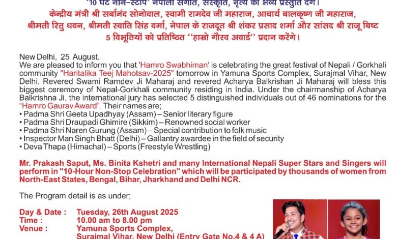 हरिद्वार।अंतर्राष्ट्रीय सुपर स्टार और कलाकार दिल्ली के यमुना स्पोर्टस कम्प्लेक्स में ‘10 घंटे नान-स्टाप’ नेपाली संगीत, संस्कृृति, नृत्य की भव्य प्रस्तुति देंगे।केन्द्रीय मंत्री श्री सर्बानंद सोनोवाल, स्वामी रामदेव जी महाराज, आचार्य बालकृृष्ण जी महाराज, श्रीमती रितु धवन, श्रीमती स्वाति सिंह वर्मा, नेपाल के राजदूत श्री शंकर प्रसाद शर्मा और सांसद श्री राजू बिष्ट,5 विभूतियों को प्रतिष्ठित ‘‘हाम्रो गौरव अवार्ड’’ प्रदान करेंगे।