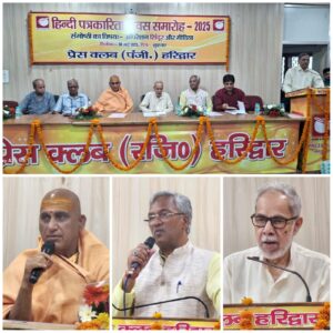 समारोह की अध्यक्षता कर रहे जूना पीठाधीश्वर आचार्य महामंडलेश्वर स्वामी अवधेशानंद गिरी ने कहा कि ऑपरेशन सिंदूर के दौरान सिंदूर का एक नया रूप शौर्य, पराक्रम, पुरुषार्थ और प्रचंडता के रूप में दुनिया के सामने आया है और संयम, संस्कृत साहसी भारत का प्रतीक बना। उन्होंने कहा कि ऑपरेशन सिंदूर में चार दिन में ही पाकिस्तान ने घुटने टेक दिए जो देश की सेना के अदम्य साहस और देश के नेतृत्व की प्रखरता और प्रतिबद्धता को दिखाता है। उन्होंने कहा कि इन चार दिनों में देश की एकता, अखंडता और वैचारिक समानता दिखाई दी। उन्होंने देशवासियों से कहा कि जल्द ही पीओके भारत का हिस्सा होगा। उन्होंने पाकिस्तान की परमाणु बम की गीदड़ भभकी पर चुटकी लेते हुए कहा कि ऑपरेशन सिंदूर से दुनिया के सामने आ गई कि जिन परमाणु बमों की पाक धमकी देता है वह तो उसके है ही नहीं और उनका नियंत्रण तो विदेशी ताकतों के हाथों में है। हिंदी पत्रकारिता दिवस समारोह में हरिद्वार के तीन विश्वविद्यालयों, संस्कृत विश्वविद्यालय, देव संस्कृति विश्वविद्यालय और गुरुकुल कांगड़ी विश्वविद्यालय के हिंदी पत्रकारिता संकाय के टॉपर छात्रों को स्वर्ण पदक प्रदान किया गया। प्रेस क्लब के दो पूर्व दिवंगत वरिष्ठ पत्रकार मधुकांत प्रेमी स्मृति सम्मान उनके पुत्र पत्रकार अवनीश प्रेमी के साथ अतिथियों ने वरिष्ठ पत्रकार कौशल सिखौला को प्रदान किया। जबकि वरिष्ठ पत्रकार प्रेस क्लब के पूर्व अध्यक्ष प्रोफेसर पीएस चौहान स्मृति सम्मान उनकी पत्नी महिला आयोग की पूर्व अध्यक्ष संतोष चौहान के साथ अतिथियों ने युवा पत्रकार संदीप रावत को प्रदान किया गया। वरिष्ठ पत्रकार आदेश त्यागी के संयोजन में आयोजित समारोह का संचालन डा.रजनीकांत शुक्ला ने किया। प्रैस क्लब अध्यक्ष धर्मेंद्र चौधरी, महामंत्री दीपक मिश्रा ने सभी अतिथीयों का शॉल ओढ़ाकर, गंगाजली, रूद्राक्ष की माला व स्मृति चिन्ह भेंटकर स्वागत किया।