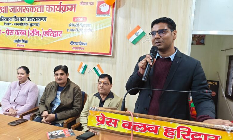हरिद्वार।सड़क दुर्घटनाओं पर प्रभावी अंकुश लगाने और आमजन को यातायात नियमों के प्रति जागरूक करने के उद्देश्य से सड़क सुरक्षा जागरूकता कार्यक्रम के तहत परिवहन विभाग हरिद्वार द्वारा प्रेस क्लब में संगोष्ठी का आयोजन किया गया। कार्यक्रम में परिवहन विभाग के अधिकारी, प्रेस क्लब पदाधिकारी एवं पत्रकार मौजूद रहे। मुख्य अतिथि एआरटीओ प्रशासन निखिल शर्मा तथा विशिष्ट अतिथि एआरटीओ प्रवर्तन नेहा झा ने यातायात नियमों की जानकारी देते हुए दुघर्टनाओं से बचाव के लिए वाहन चलाते समय नियमों का पालन करने, सीट बेल्ट लगाने और दोपहिया वाहन चलाने के दौरान हेलमेट अवश्य लगाने की अपील की और सभागार में मौजूद सभी पत्रकारों को यातायात नियमों का पालन करने की शपथ भी दिलायी। इस दौरान परिवहन विभाग की और से सभी पत्रकारों को हेलमेट भी वितरित किए गए। प्रेस क्लब अध्यक्ष धर्मेंद्र चौधरी, महामंत्री दीपक मिश्रा एवं कार्यक्रम संयोजक आशीष मिश्रा ने सभी अतिथियों का पुष्पगुच्छ भेंट कर स्वागत किया। गोष्ठी का संचालन प्रेस क्लब महामंत्री दीपक मिश्रा ने किया।